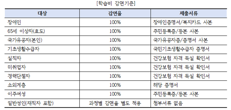 - 학습비감면에 해당되는 경우 관련 서류(한달이내 발급 서류)